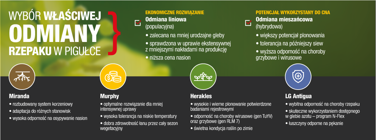 Dokonując wyboru odmiany, przede wszystkim należy wziąć pod uwagę warunki glebowe oraz agrotechniczne panujące w gospodarstwie. Intensywny postęp hodowlany przyczynił się do zwiększenia potencjału plonowania rzepaku nawet na mniej zasobnych stanowiskach – powyżej IV klasy. Niezbędny jest jednak dostęp do wody i składników pokarmowych. Dlatego przy wyborze odmiany na słabsze stanowiska, należy zwrócić szczególną uwagę na rozwiązania, które wyróżniają się silnie rozbudowanym systemem korzeniowym. Dzięki temu rośliny są w stanie dotrzeć do głębszych warstw gleby – zasobnych w wodę i składniki pokarmowe, maksymalnie wykorzystując jej możliwości.