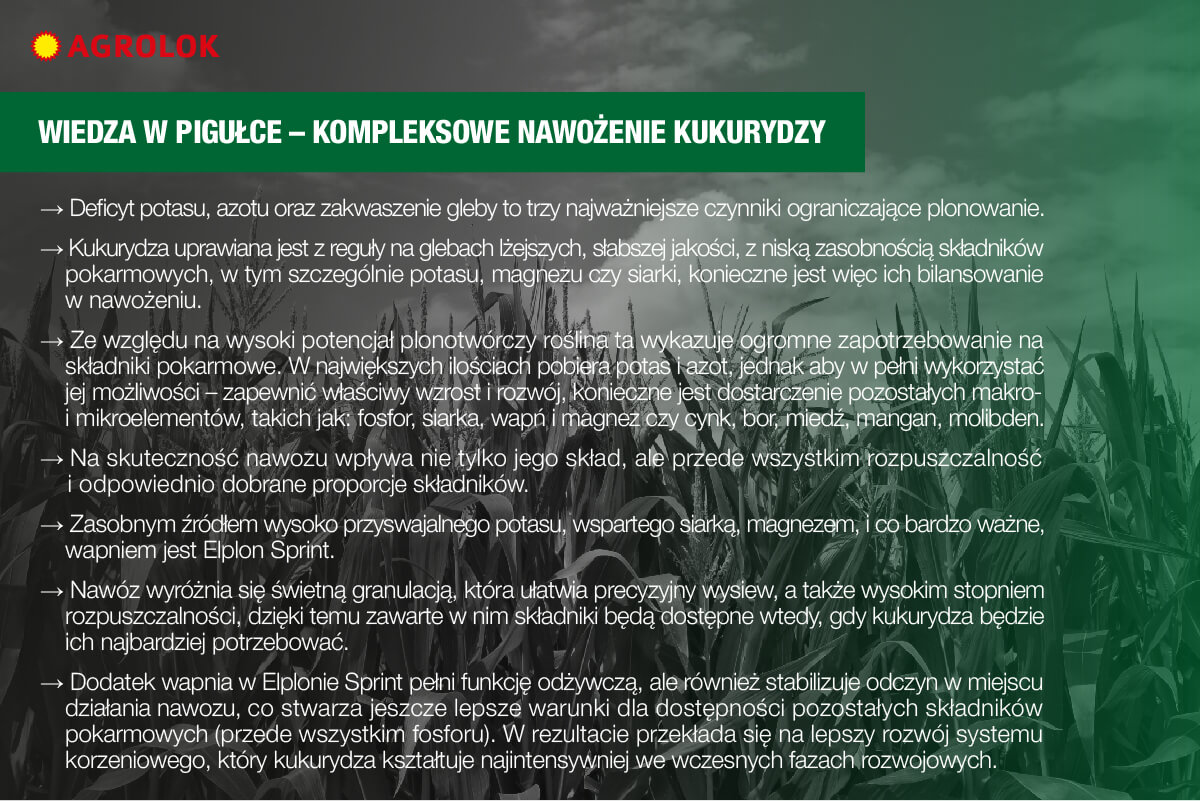Deficyt potasu, obok niedoboru azotu i zakwaszenia gleby, stanowi najważniejszy czynnik ograniczający plonowanie. Co więcej, na stanowiskach, na których z reguły uprawia się kukurydzę – gleby lżejsze, gorszej jakości, występuje zazwyczaj niska zasobność tego pierwiastka, jak również innych kluczowych składników. Wystarczy wspomnieć, że kukurydza w ciągu sezonu wegetacyjnego pobiera ponad 200 kg K2O. Biorąc pod uwagę wskazane czynniki, a także coraz większe oczekiwania plantatorów, co do wielkości uzyskiwanych plonów, konieczne staje się bardziej precyzyjne nawożenie, uwzględniające dostarczenie wszystkich składników. Najlepiej w łatwo przyswajalnych formach.