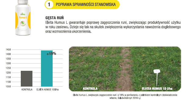 Problem z produkcyjnością użytku zielonego notorycznie pojawiają się w pierwszym roku uprawy. Wielu rolników twierdzi, że ich główną przyczynę stanowią kłopoty ze wschodami i zagęszczeniem runi. Zazwyczaj spowodowane jest to mniejszą sprawnością i żyznością stanowiska, zwłaszcza we wierzchniej warstwie gleby. Warto podkreślić, że o początkowej produkcyjności użytku zielonego decyduje początkowy okres wzrostu, podczas wschodów oraz późniejszego krzewienia. Z czego to wynika? Trawy są siane płytko, często również w przesuszoną glebę, wskutek zabiegów doprawiających, co powoduje wolniejsze wschody, mniejszą siłę ukorzenienia i słabe zagęszczenie runi. Multisa zmniejsza wpływ warunków glebowych, a także pozwala na poprawę produktywność użytku już w pierwszym roku uprawy. Na uprawioną glebę należy zaaplikować płynny nawóz organiczny Elvita Humus L. Preparat zawiera kwasy humusowe i fulwowe, wpływa na zagęszczenie runi poprzez poprawę wykorzystania nawożenia doglebowego oraz wzmocnienie ukorzenienia. Co więcej nawóz można stosować bezpośrednio po siewie, dzięki temu szczególnie dobrze sprawdza się w przypadku podsiewu istniejącego już użytku, który wymaga tylko renowacji.