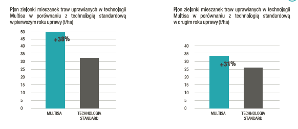Aktualnie w trzecim roku użytkowania z I pokosu traw uprawianych w technologii Multisa uzyskano 26,7 ton zielonki w przeliczeniu na jeden hektar. Było to o 31,5% więcej w porównaniu do technologii standard, z której zebrano 20,3 t/ha. Potwierdza to, że już trzeci rok z rzędu, pomimo zróżnicowanego przebiegu pogody technologia Multisa sprawdza się znakomicie.