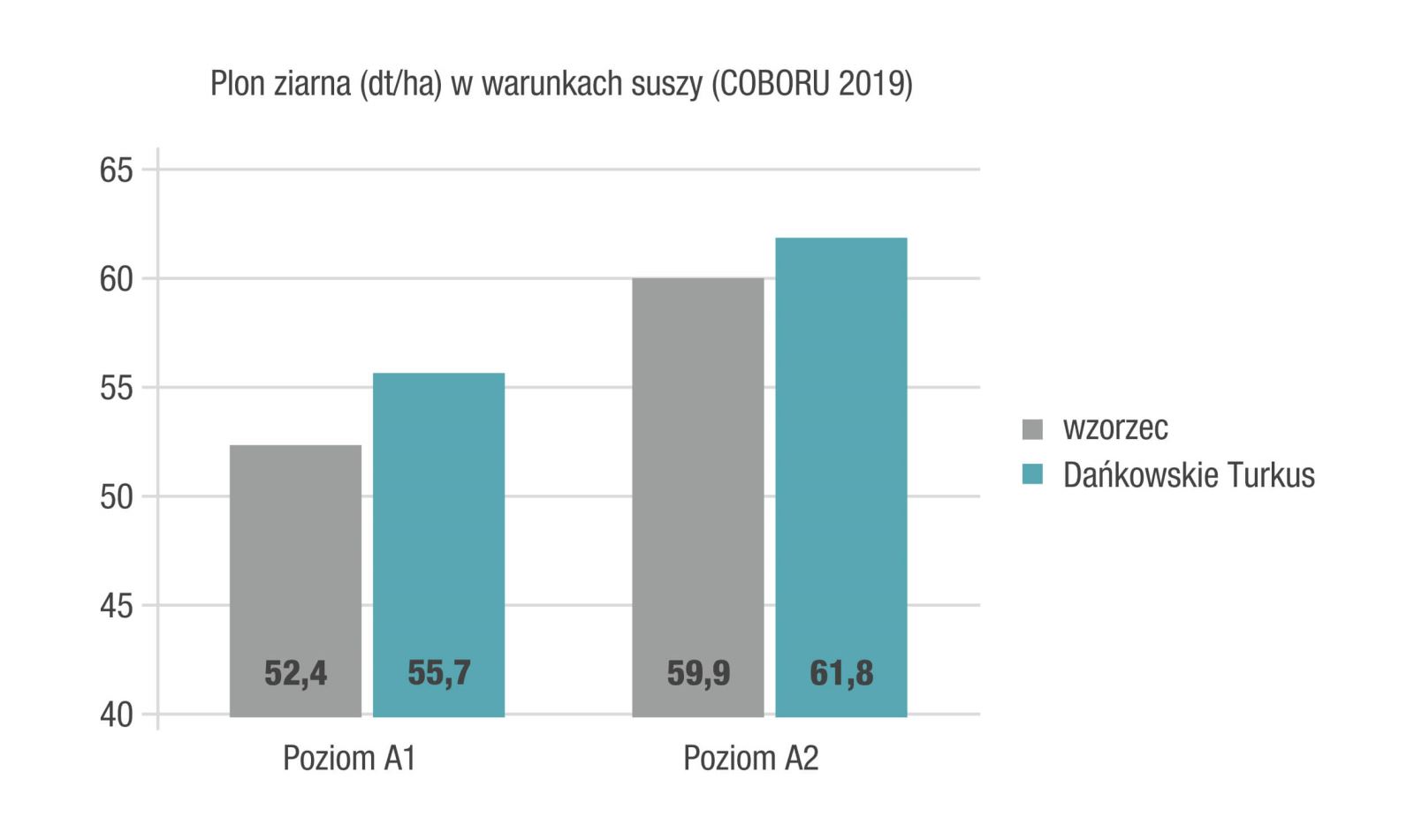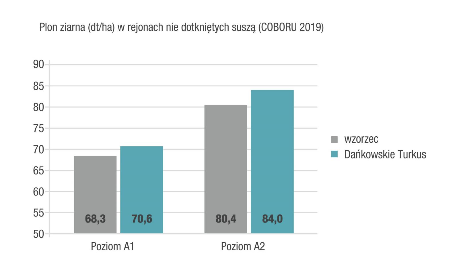 Analiza badań przeprowadzonych we wszystkich lokalizacjach doświadczalnych wskazują, że to odmiana nr 1 w plonie ziarna wśród odmian populacyjnych na obu poziomach agrotechniki (A1-105% wzorca, A2- 104% wzorca). Co więcej to również najlepiej plonująca roślina na terenach, na których występowały stresy suszowe. Wyniki te są zgodne z wnioskami z naszych kilkuletnich doświadczeń z Dańskowskie Turkus. To odmiana dobrze radząca sobie na słabszych, mniej zasobnych w składniki pokarmowe i wodę stanowiskach.