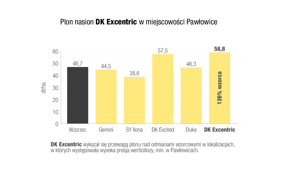 W miejscowościach, gdzie presja werticiliozy była bardzo duża, zauważono, że rośliny DK Excentric wykazują jeden z najniższych stopni porażenia tą chorobą, co bezpośrednio przełożyło się na zwyżkę plonu względem pozostałych odmian. W Pawłowicach, w stacji doświadczalnej, gdzie w 2021 roku wystąpiło największe nasilenie wericiliozy, DK Excentric utrzymał najwyższy plon (5,9 t/ha – 126% wzorca!) z porównywanych odmian (patrz: wykres).