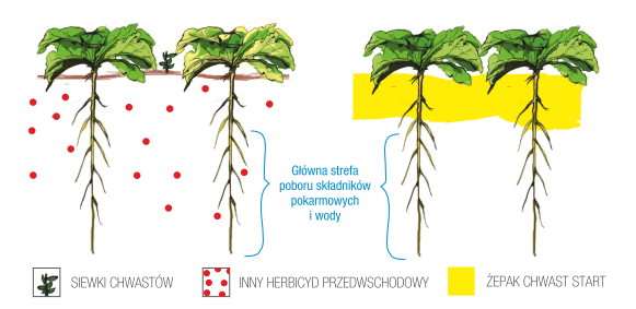 Wybierając przedwschodową strategię odchwaszczania rzepaku, dobrze jest wziąć pod uwagę rozwiązanie z dodatkiem adiuwanta do herbicydów doglebowych. Jego zastosowanie zwiększa bezpieczeństwo rzepaku z uwagi na dłuższe utrzymywanie substancji aktywnych herbicydów w wyższej warstwie gleby, co zmniejsza możliwość pobrania jej przez rzepak i w konsekwencji wystąpienia „przebieleń” na liściach. Poza tym zwiększa się skuteczność chwastobójcza całego zestawu, ponieważ adiuwant, zmniejszając tendencję do przemieszczania herbicydów w głąb profilu glebowego, wpływa na to, że praktycznie wszystkie kiełkujące chwasty mają z nimi kontakt (rys.1).