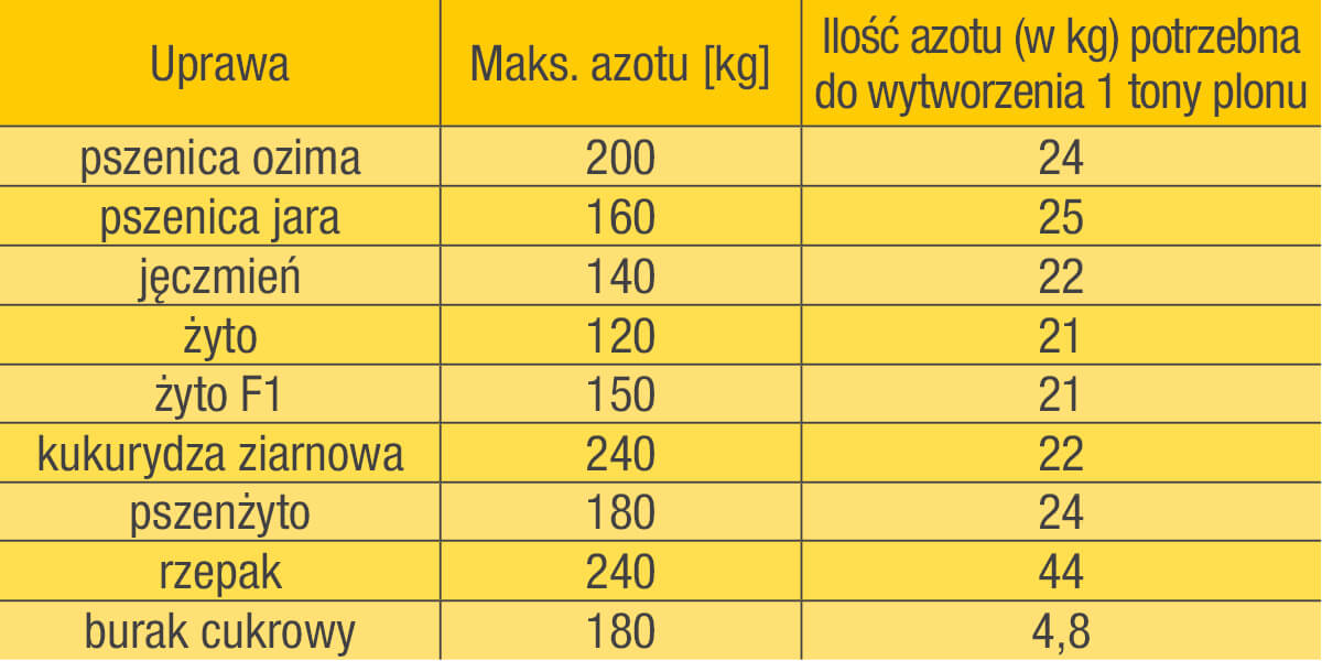 Zgodnie z założeniami dyrektywy azotanowej maksymalne ilości azotu wnoszone przez rolnika z nawozów mineralnych i organicznych (z zastosowaniem równoważników nawozowych) dla upraw w plonie głównym wynoszą: