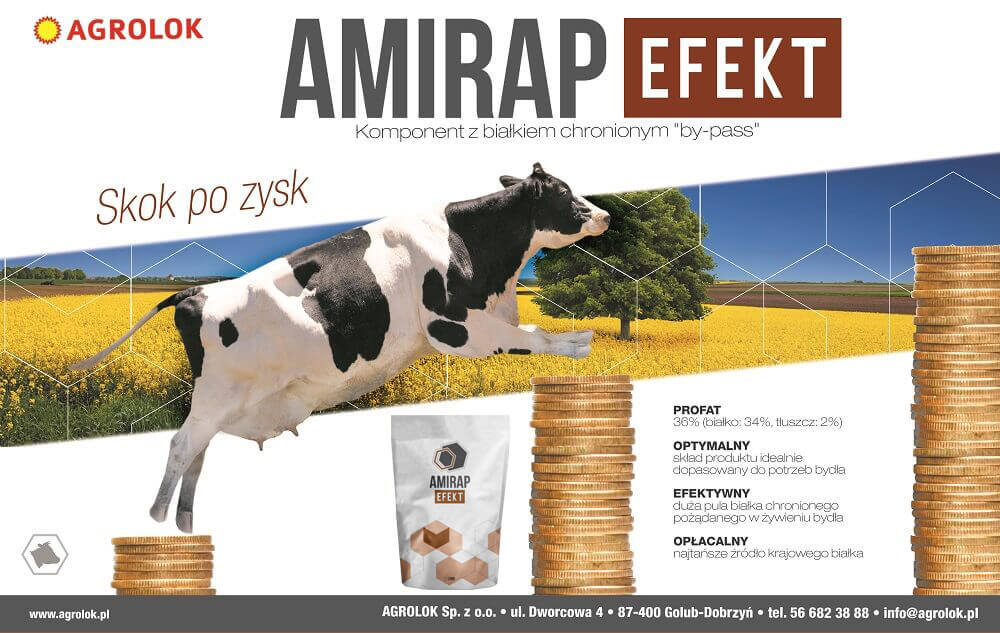 Producentom mleka z pomocą przychodzi Amirap Efekt – innowacyjny na polskim rynku komponent paszowy non GMO, który zawiera ponad 60% białka by-pass. Produkowany jest dzięki pierwszej w Polsce linii technologicznej do produkcji białka chronionego. Innowacyjny proces sprawia, że komponent Amirap Efekt wyróżnia się ponad dwukrotnie wyższym udziałem białka nierozkładanego przez mikroorganizmy żwacza w porównaniu do poekstrakcyjnej śruty rzepakowej i znacznie wyższym niż w poekstrakcyjnej śrucie sojowej. Wieloetapowy proces wykorzystuje tylko metody fizyczne (temperatura, ciśnienie) do zmiany struktury białka, dzięki czemu jest ono niedostępne dla mikroorganizmów żwacza, a jednocześnie jest trawione w jelicie cienkim. Za sprawą obróbki technologicznej Amirap Efekt uzyskuje również jednorodną strukturę (bez grudek i zbryleń) oraz atrakcyjny zapach i smak, zachęcający zwierzęta do zwiększonego pobrania paszy.