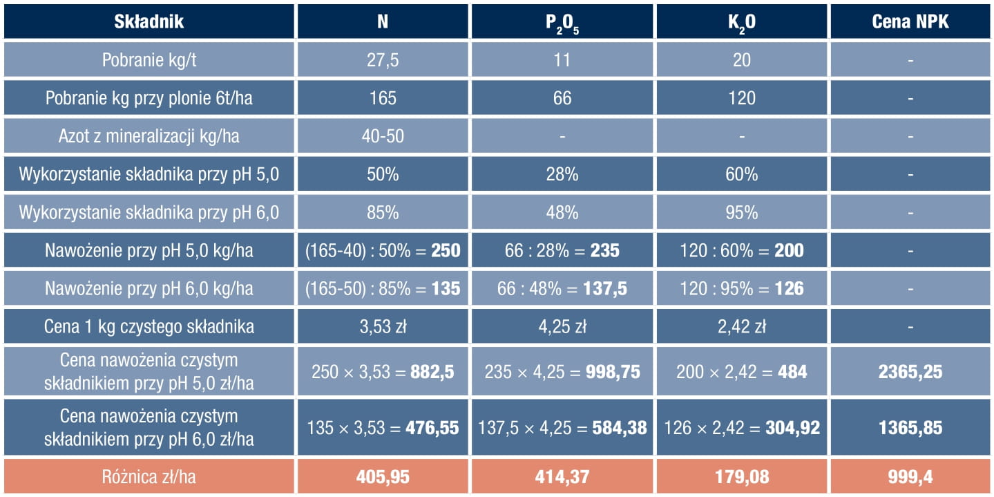 Aby wyjaśnić to zagadnienie – i wskazać, jak duże straty mogą wynikać z nieuregulowanego odczynu gleby, obliczono ekonomikę zabiegu, bazując na standardowych parametrach. Podstawą do określenia opłacalności zabiegu była efektywność pobierania składników, a także wzrost plonów po przeprowadzeniu zabiegu. W kalkulacji uwzględniono pszenicę ozimą, z której rolnik chce uzyskać plon na poziomie 6 ton ziarna. Na plantacji nie aplikowano nawozów naturalnych ani organicznych zaś gleba wykazuje średnią zasobność w potas i fosfor.