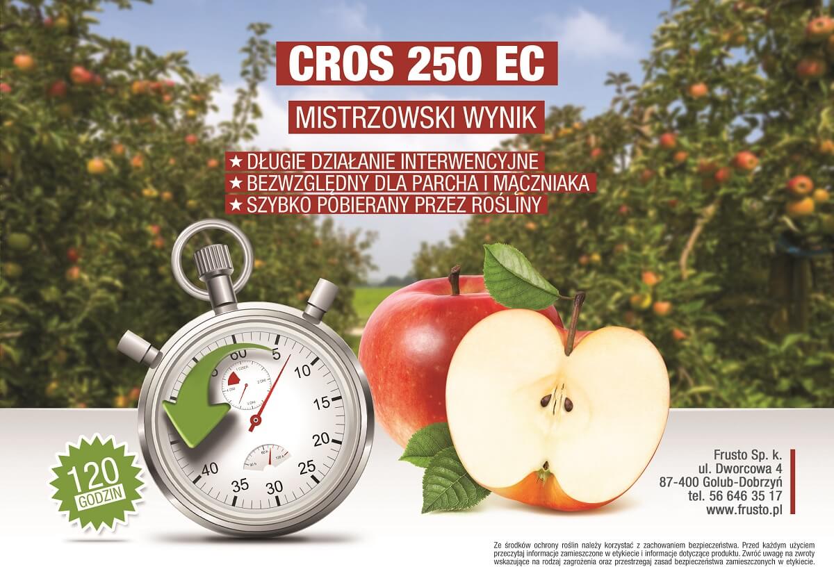 Cros 250 EC to preparat grzybobójczy w formie koncentratu do sporządzania emulsji wodnej. Preparat działa układowo, stosuje się zapobiegawczo i interwencyjnie w ochronie jabłoni przed parchem jabłoni i mączniakiem jabłoni. Środek Cros 250 EC wykazuje działanie wyniszczające w zwalczaniu parcha. Dla doskonałej ochrony wykonuje się dwa zabiegi w odstępie co najmniej 5 dni. Zabiegi można wykonywać od fazy różowego pąka kwiatowego do końca fazy kwitnienia.